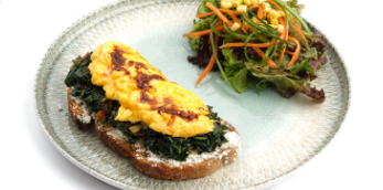 Ekşi maya ekmek üstüne labne, lor peyniri, sote ıspanak ve scrambled egg ile servis edilir.