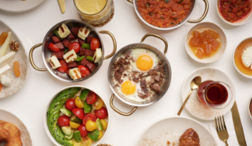 Bal, kaymak, çıtır kabak, vişne reçeli, peynir tabağı, zeytin, nutella, patlıcanlı ezme, salata kasesi, sucuk hellim sote, karışık kızartma, pişi, kruvasan, menemen, kavurmalı yumurta ile servis edilir. (Kişi başı ek ücret 800₺’dir.)