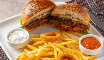 150 gr köfte, burger sos, aysberg, domates, turşu, karamelize soğan, patates kızartması, özel soslar ve soğan halkası ile