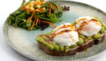 Ekşimaya ekmek üstü avokado püresi, poşet yumurta ve hollandaise sos ile servis edilir.
