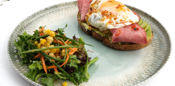 Ekşi maya ekmek üstüne labne, cheddar, füme et ve göz yumurta ile servis edilir.