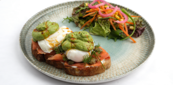 Ekşi maya ekmek üstüne ekşi krema, füme somon, kapari, dereotu ve poşe yumurta ile servis edilir.