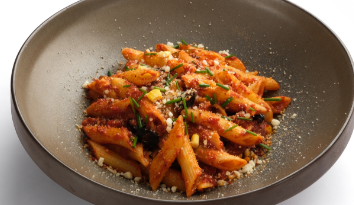Penne makarna, özel sos, zeytin, mısır ve parmesan peyniri ile servis edilir.