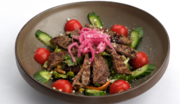 Akdeniz yeşillikleri, domates, salatalık, mısır, Meksika fasulyesi, havuç, ceviz, ızgara soğan ve bonfile ile servis edilir.