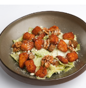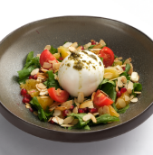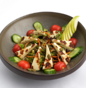 Akdeniz yeşillikleri, ıspanak, semizotu, mısır, havuç, domates, yaban mersini, kabak çekirdeği, salatalık, yeşil elma, file badem ve sote tavuk ile servis edilir.